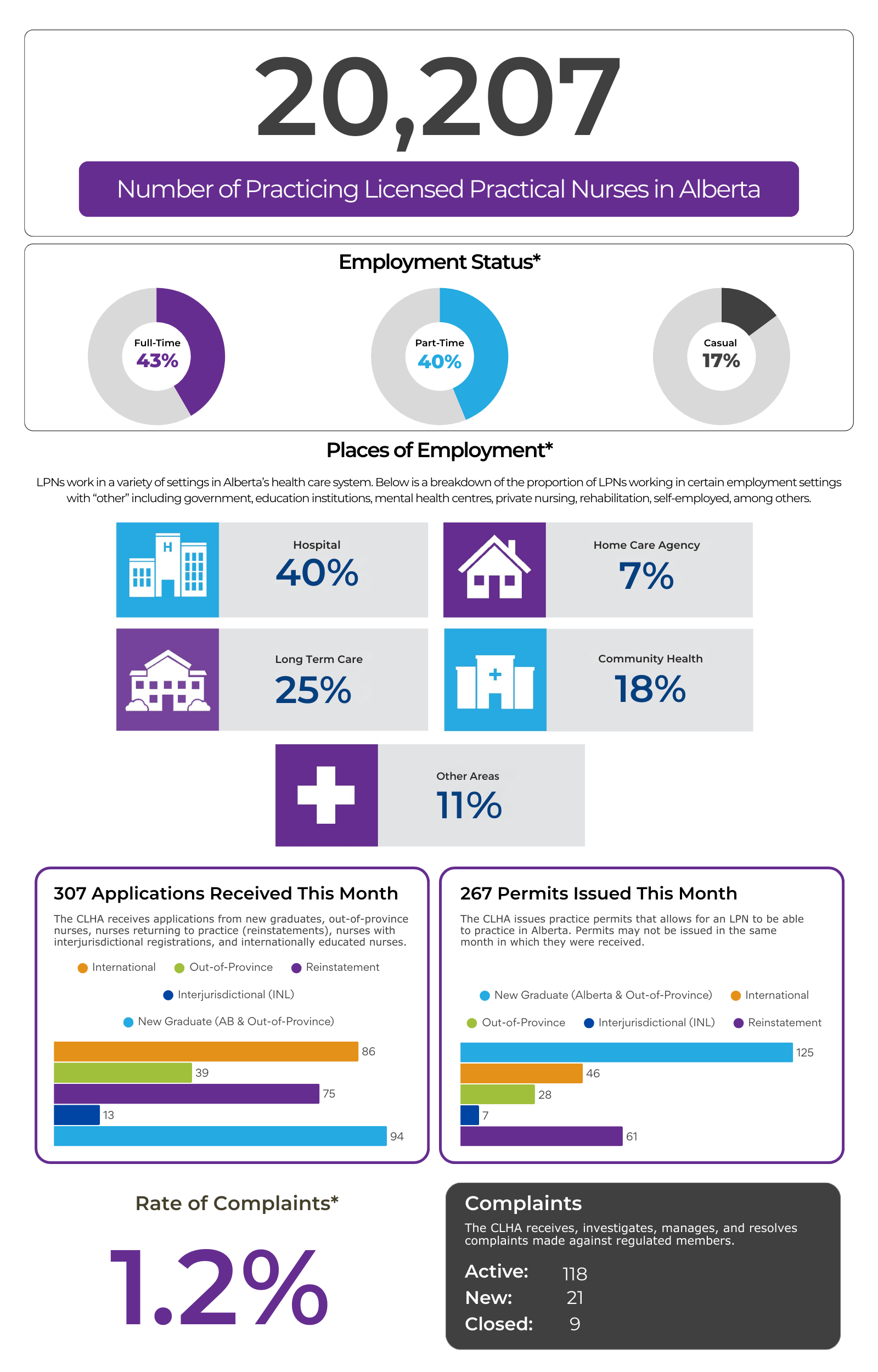 As the regulatory body for Licensed Practical Nurses in Alberta, the CLHA collects information that provides insights into the profession. The CLHA is committed to sharing its information and data about LPNs in Alberta with the public, registrants, and health system partners. If you have any questions or are interested in learning more, please contact pmr@clha.com.