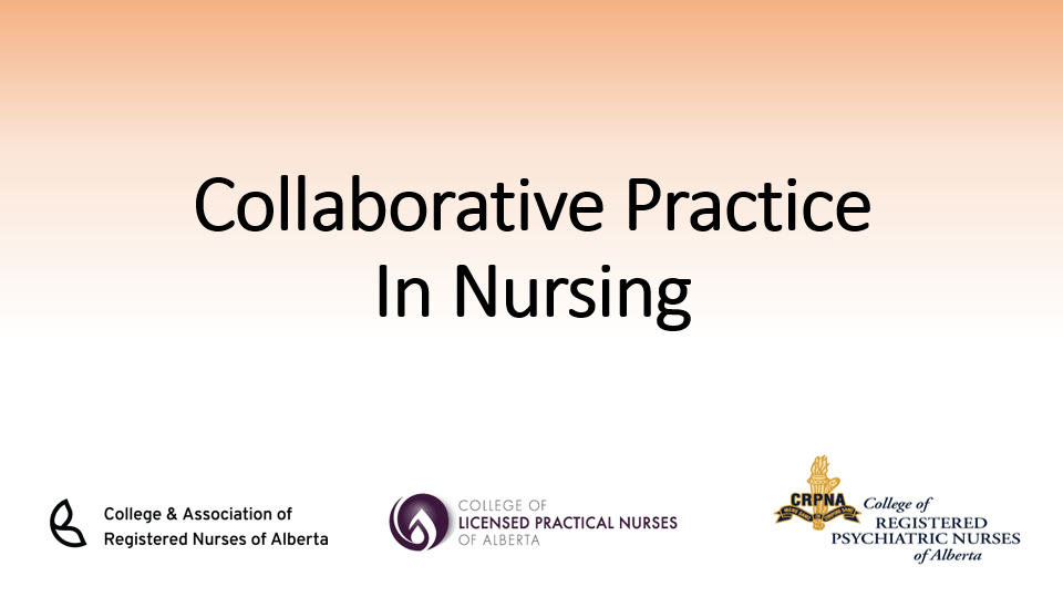 Collaborative practice is a deliberate and committed professional approach to communication and decision making. Collaborative practice is based on a foundation of client-centred care, open communication, mutual trust, shared decision-making and accountability, and respect and value of the knowledge and experience each unique nursing profession provides as part of the care team. This document provides clarification and increases understanding of collaborative practice principles. These principles support nurses to practice collaboratively in any setting.